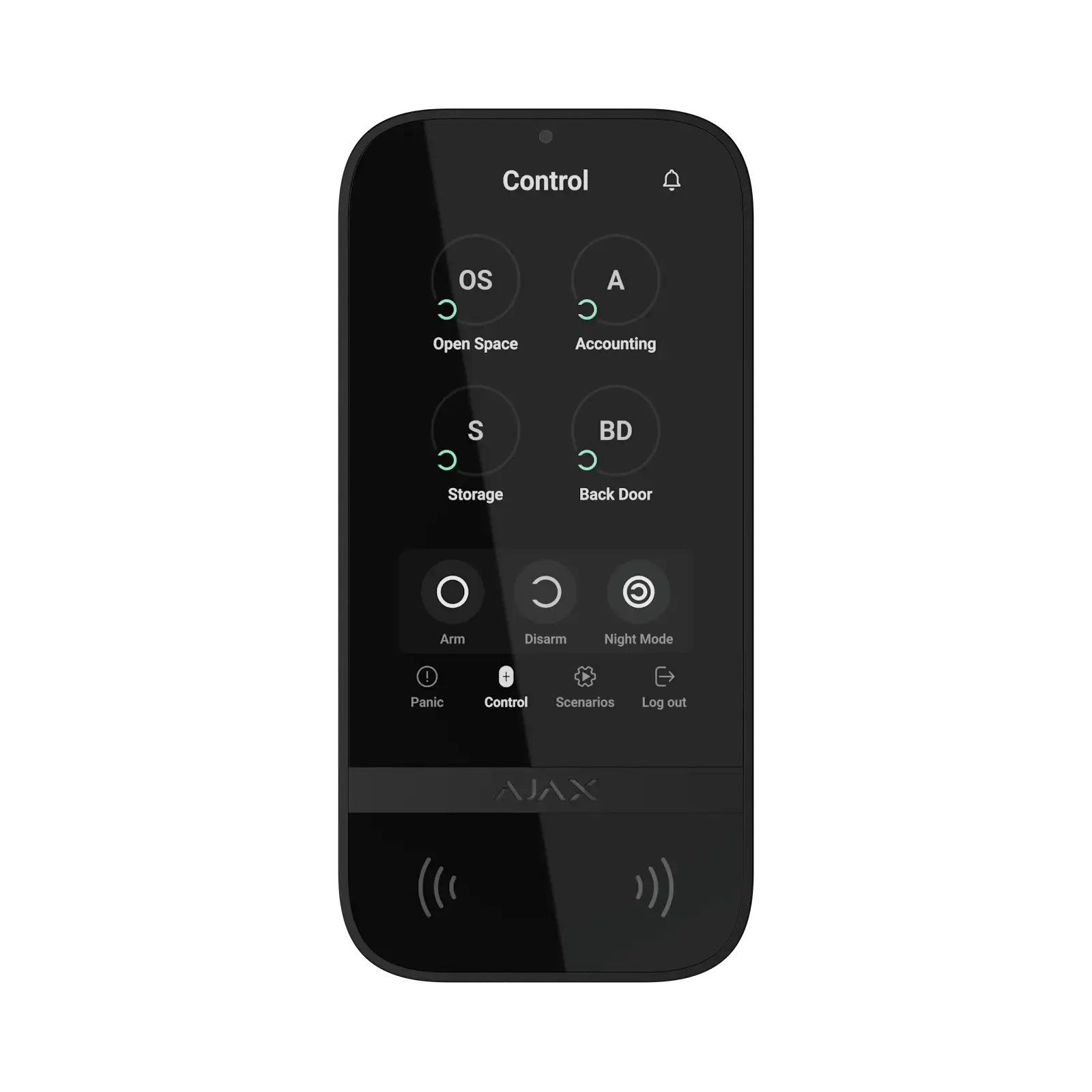 KeyPad is a wireless indoor touch-sensitive keyboard managing the Ajax system. Designed for indoor use. With this device, the user can arm and disarm the system and see its security status. KeyPad is protected against attempts to guess the code and can raise a silent alarm when the code is entered under duress.